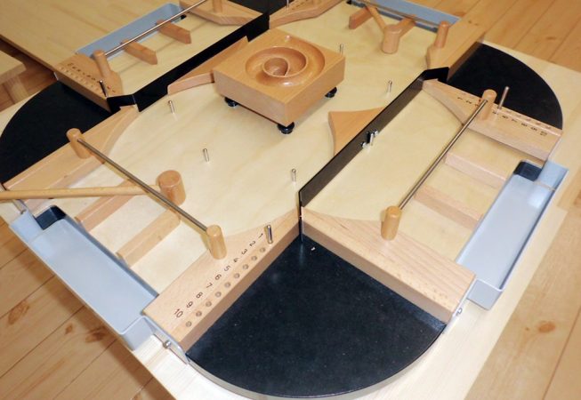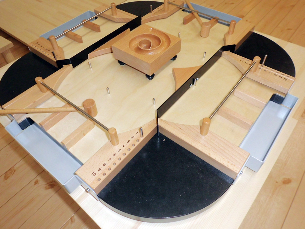真ん中の渦状の穴に落とした玉が傾斜している板の上を滑ります。各プレイヤーはハンマーで自分の陣地を守りながら、相手の陣地を目指して玉を飛ばします。特製の柵を利用して2~4人まで対戦できます。